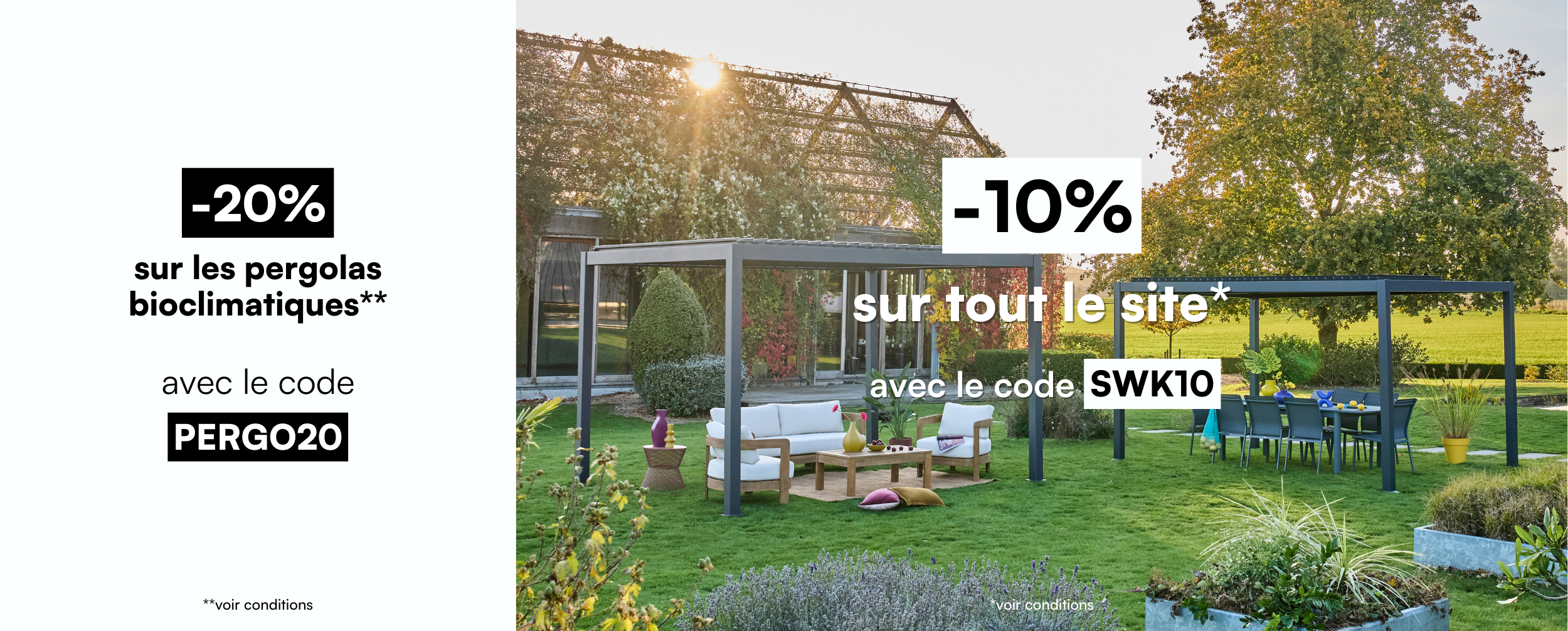 Chez sweeek, nous avons à cœur de vous proposer les meilleures solutions pour votre mobilier de jardin : salon de jardin bois, salon de jardin aluminium ou salon de jardin résine tressée, le choix sera difficile pour vous devant notre large gamme de produits exclusifs. Pour compléter votre mobilier de jardin, nous vous proposons un fauteuil extérieur, un transat ou un bain de soleil pour vous relaxer tranquillement sous votre parasol, votre tonnelle ou votre pergola bioclimatique. Vous allez prendre des grandes vacances au quotidien.