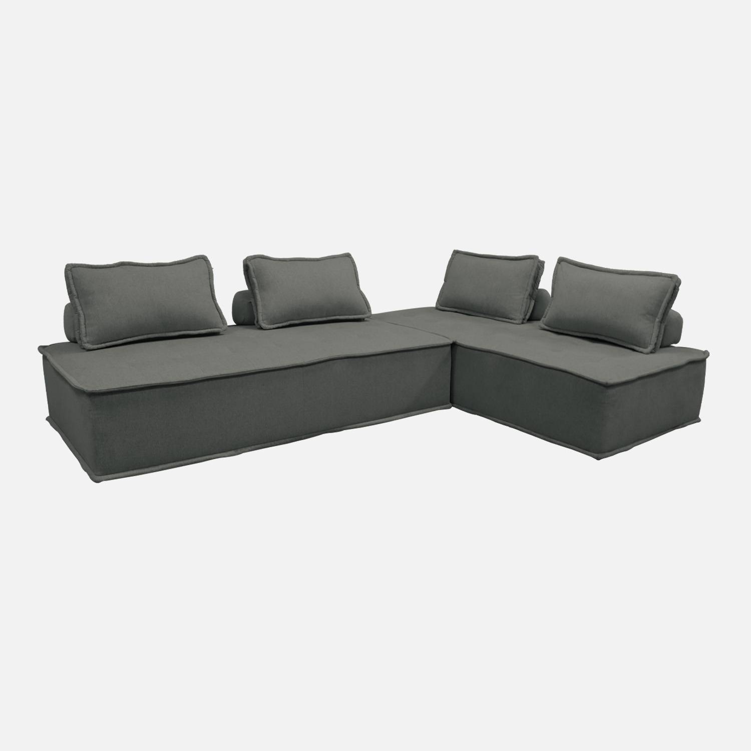 - Canapé d’angle : le canapé d’angle est très utile pour allonger ses jambes. Lorsqu’il est modulable et réversible, vous pouvez même parfois changer l’angle et le mettre à gauche ou à droite selon vos envies. Petit conseil : attention cependant à ne pas vous tromper de côté (gauche ou droit) si le canapé n’est pas réversible ou modulable !
