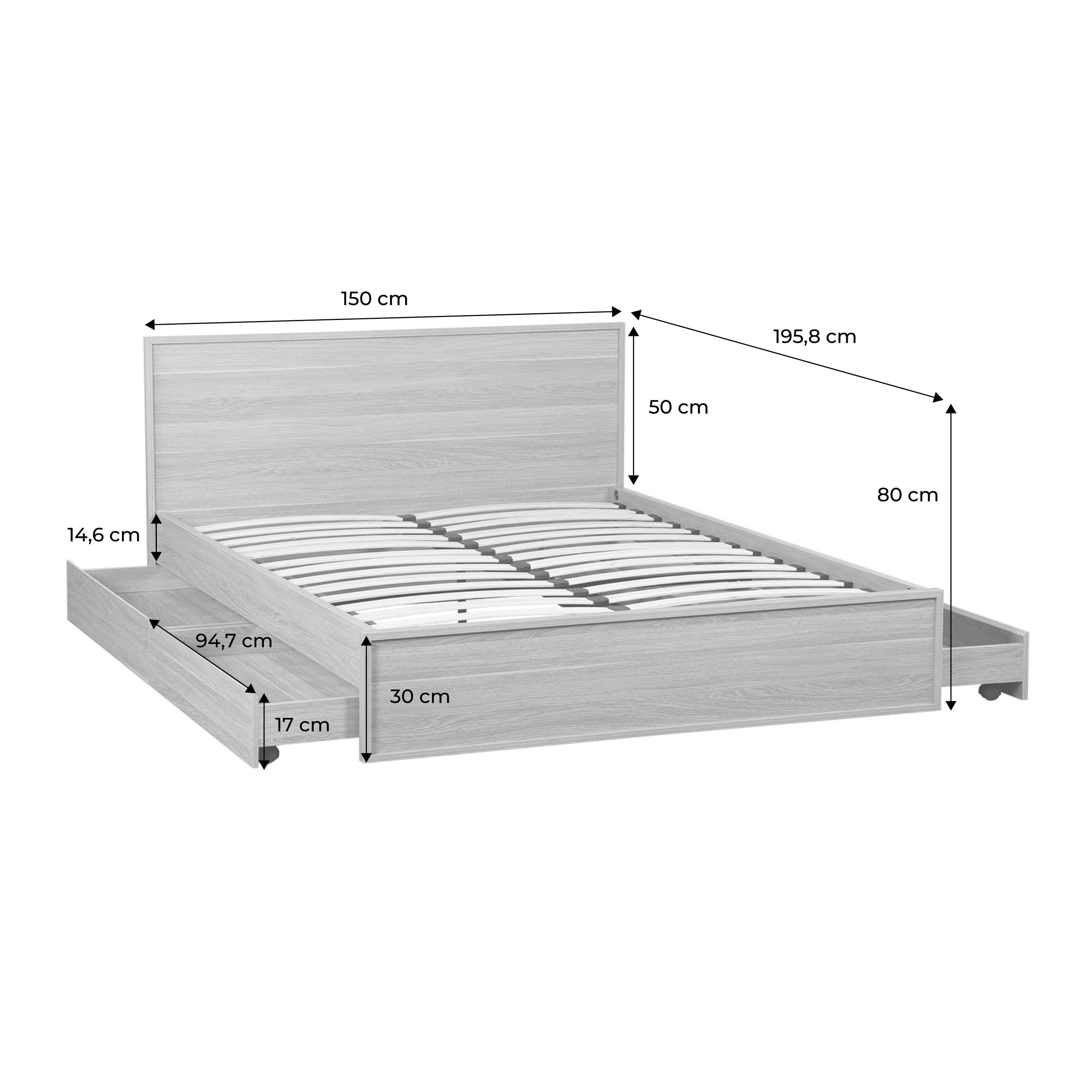 Lit avec sommier à lattes et tête de lit 140 x 190cm + 4 tiroirs décor bois