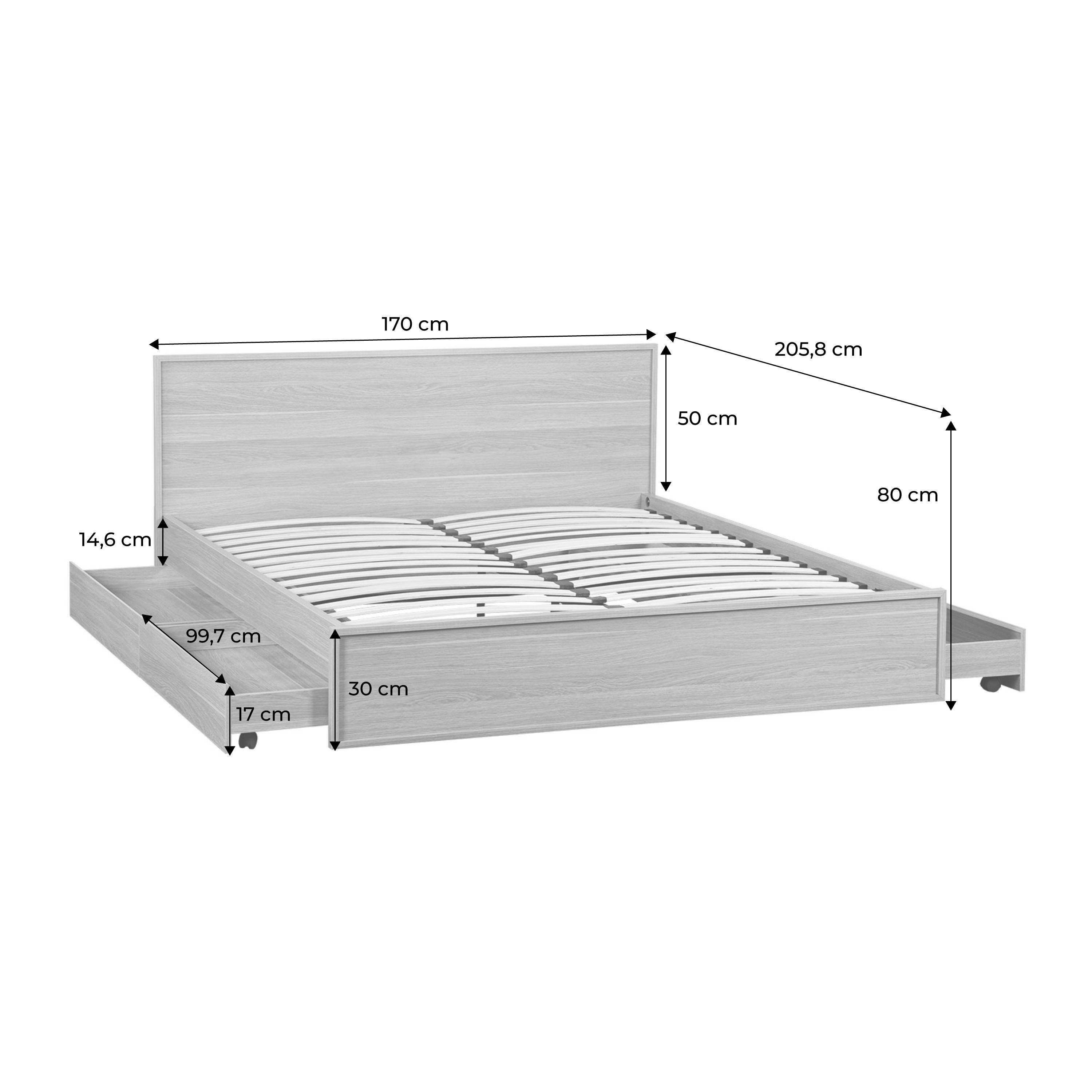 Lit avec sommier à lattes et tête de lit 160 x 200cm + 4 tiroirs décor bois